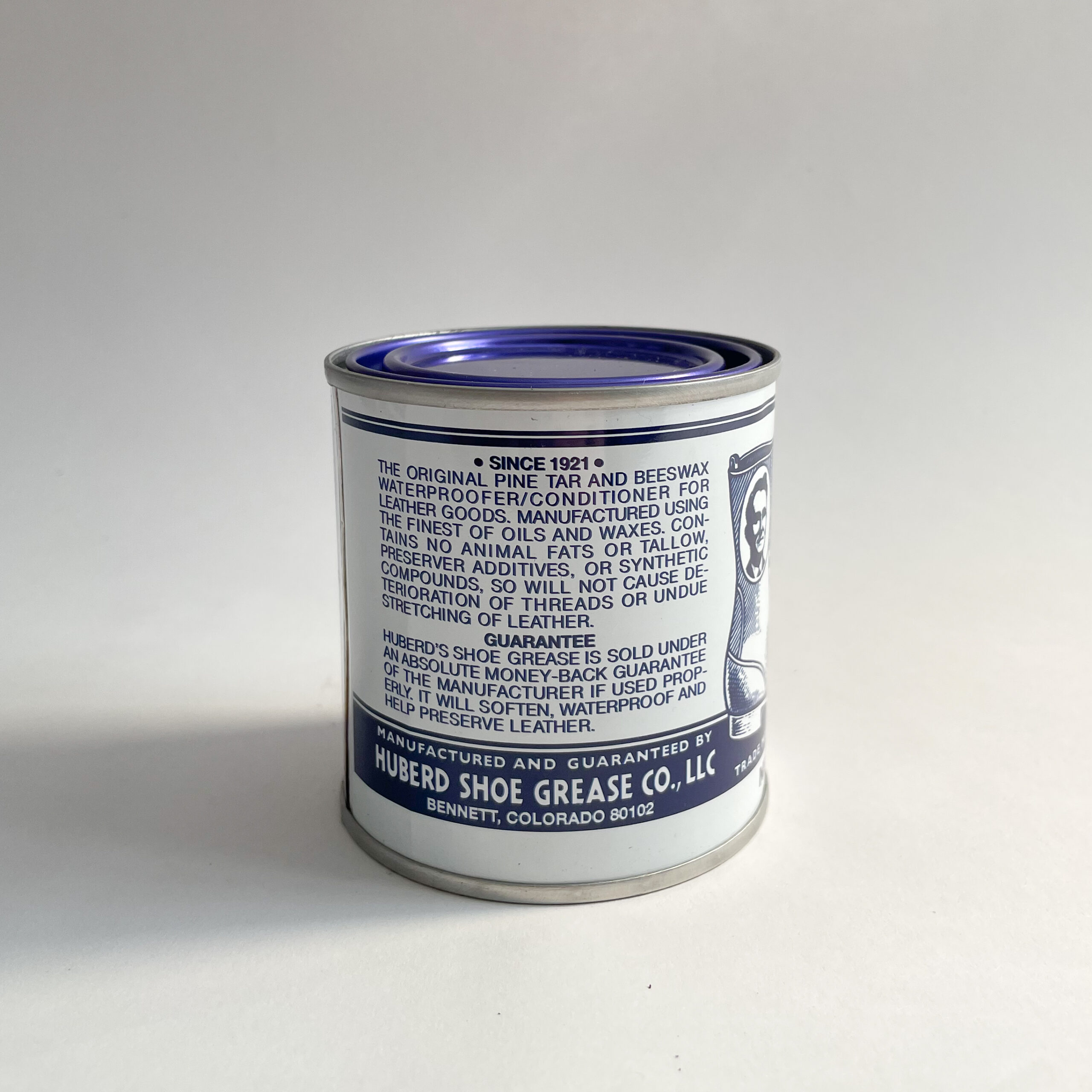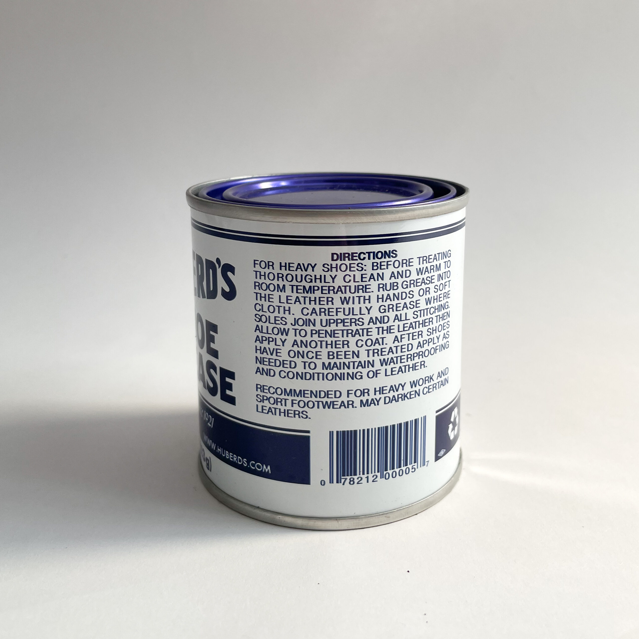 One can of Original Huberd’s Shoe Grease. Made in Colorado, USA, this is a classic leather care product for anyone looking to prolong the life of their leather goods. When initially applied, your leather will have a bit of an oily sheen to it. Overnight, it will sink into your leather, leaving it hydrated and supple. Apply a small amount to start. Not recommended for Suedes, Nubuck or Roughout, as it will flatten the nap irreversibly. May darken leather.